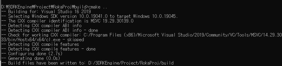 2.build 파일을 생성하여 그곳을 경로로 cmd창 -> cmake [CMakeLists 경로] 를 입력한다.