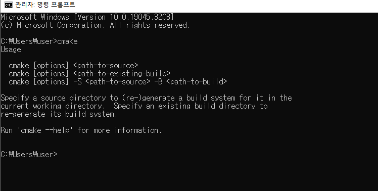 cmd 창에 cmake 쳤을때 아래와 같이 나오면 성공