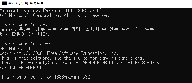 3.cmd 창에서 make -v 쳤을때 사진과 같게 나오면 설치된 것.