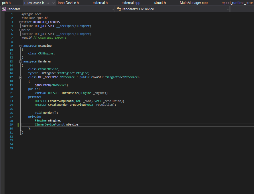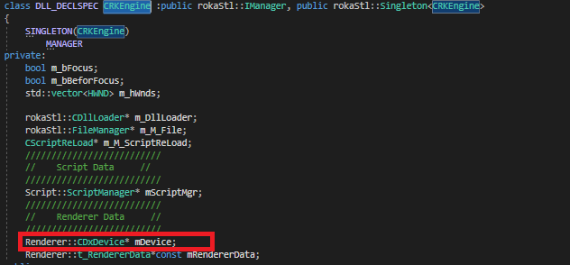 Renderer.dll에서 export 정보를 남긴 CDxDevice에는 외부 공개 하고자 하는 변수만 멤버 변수로 쓸수 있어서